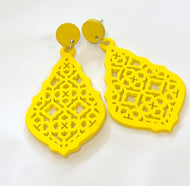 Yellow and Purple Wooden Laser Etched Lattice Teardrop Earrings