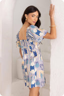 Piping Contrast Vase Print Mini Dress: Blue Multi/off-white / S