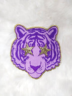 Purple Tiger Mascot Star Eyes Large Chenille Iron-on Patch