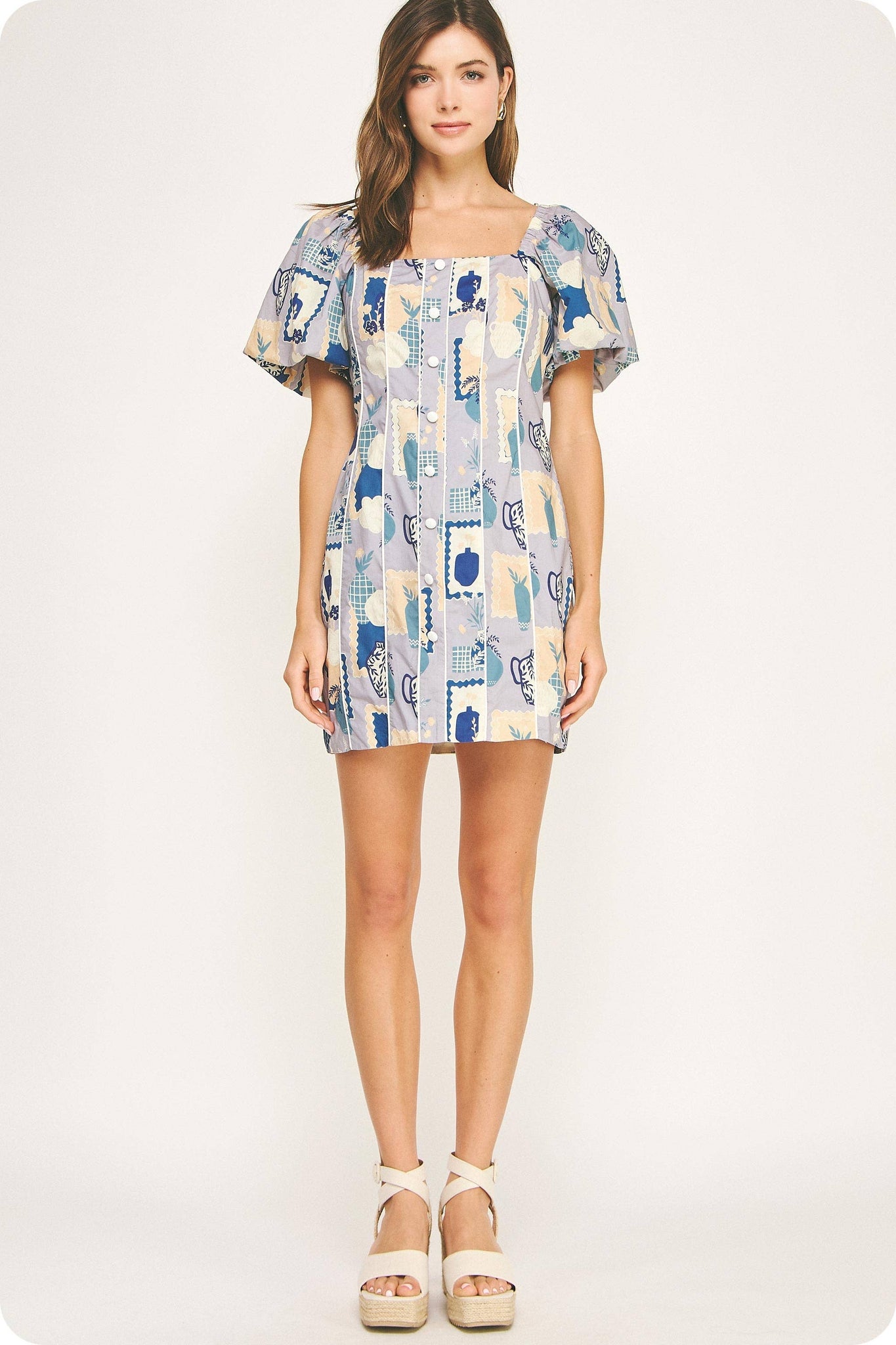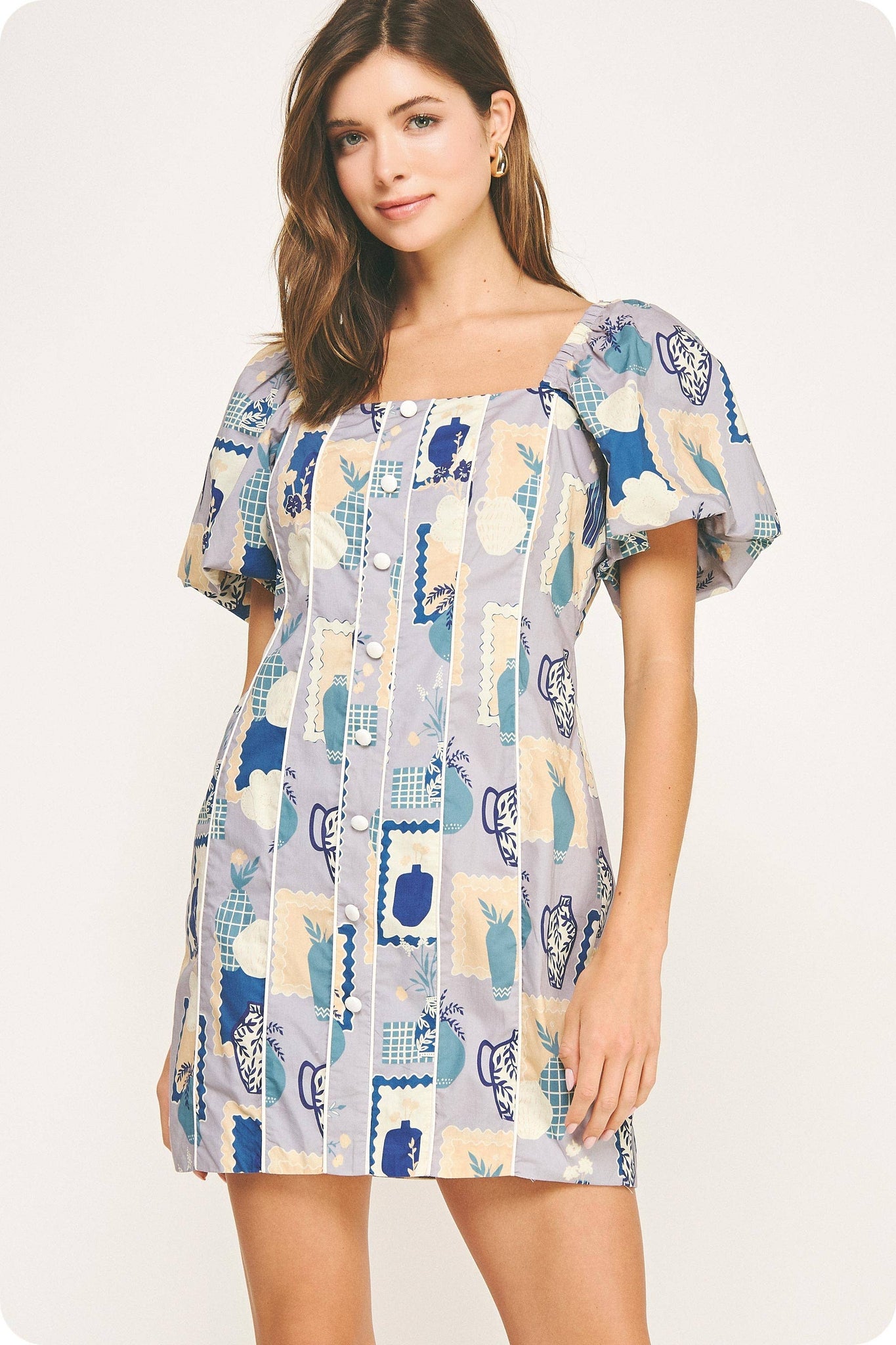 Piping contrast sheath mini dress in a vase print on cotton poplin fabric. This style features a square neckline, raglan puff short sleeve with elasticated shoulder, button detail at front, contrast color piping detail throughout, lining, and a hidden zipper closure at center back.