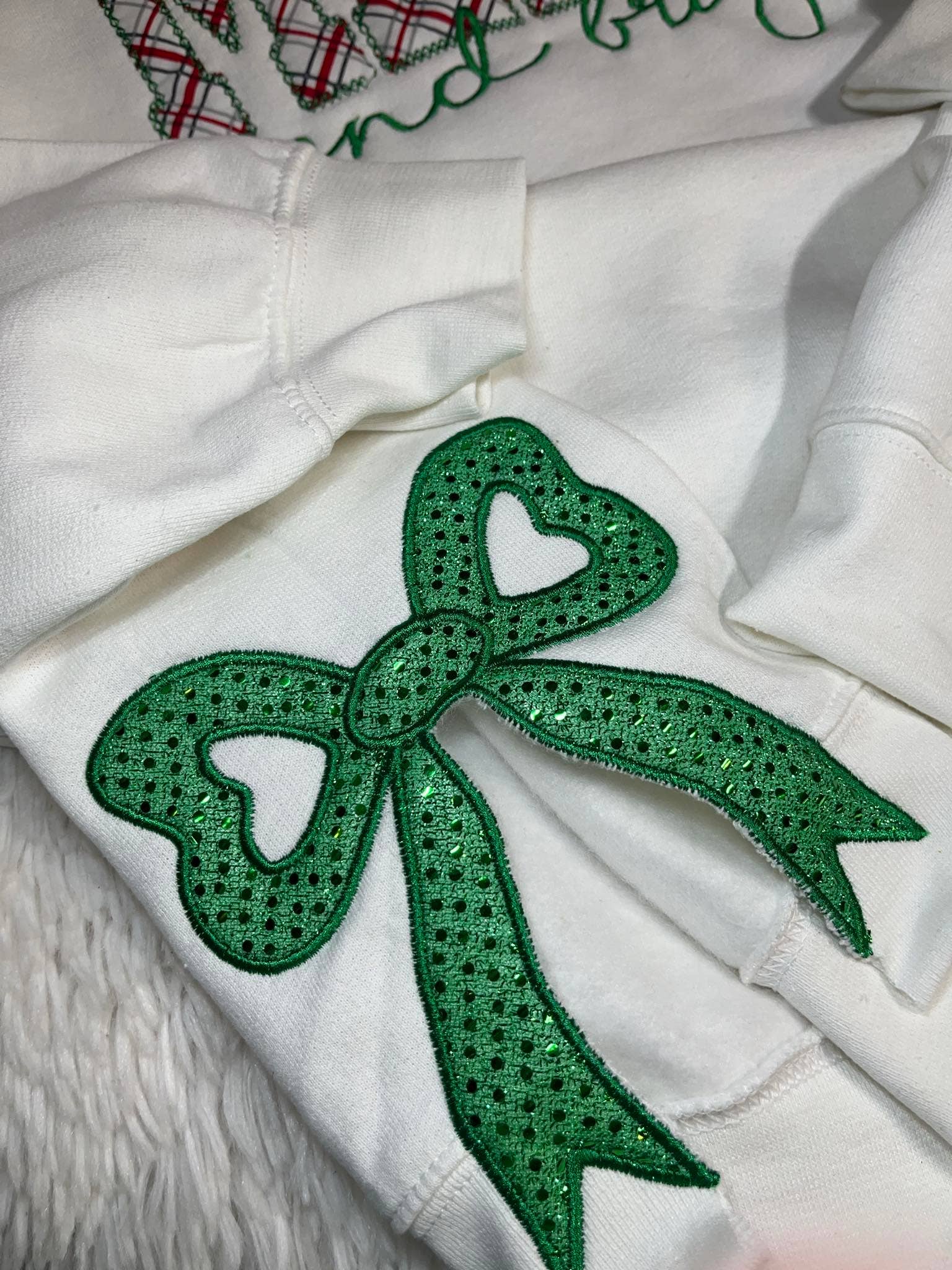 Made on a White sweatshirt with glitter applique bow on the side embroidery reading "Merry and Bright"-- so cute!